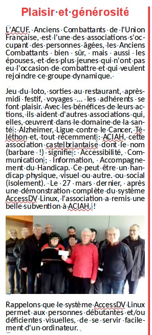 L’association ACIAH est bien soutenue ! Partout où nous pouvons faire une démonstration, nous recueillons encouragements et félicitations. C’est très réconfortant pour nous et nous incite à poursuivre.