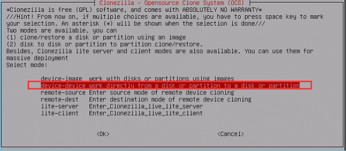 Etape 5 - Choisir 2e ligne : device-device disque/partition vers disque/partition pour cloner directement d'un disque à un autre. Et validez.