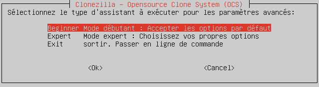 Étape 7 - Choisir le mode expert ou débutant pour exécuter Clonezilla. Et valider.
