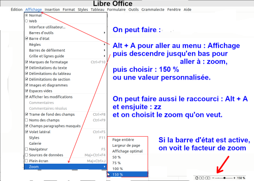 Autre façon : on fait le raccourci : Alt + A et ensuite on frappe deux fois la touche z et on arrive à une petite fenêtre qui permet de choisir le facteur de zoom.